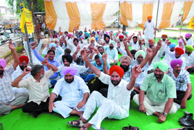 Members of the Revenue Patwar Union Punjab staging a protest near the District Administrative Complex in Bathinda on Friday. Tribune photo: Pawan Sharma
