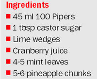 Instructions Muddle mint, pineapple chunks, castor sugar and lime in a mixing glass. Add 100 Pipers and ice in a cocktail shaker and shake. Put the mixture into a tall glass, add crushed ice and top with cranberry juice. Garnish with lime wedge. About Pink Floyd: Pink Floyd was one of the most commercially successful and influential rock bands of all time. (Mishra is a Chandigarh- based cocktail jockey)