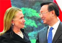 US Secretary of State Hillary Clinton with Chinese Foreign Minister Yang Jiechi at a joint press conference in Beijing on Wednesday. — AP/PTI Pirates hijack ship with 23 Indians aboard Pak approves draft bill to tackle financing of terrorism