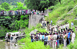 Batote/Srinagar, September 7 Five persons were killed and 15 injured when a Doda-bound minibus skidded of the Doda-Bhaderwah road into the Neeru nullah at Seri, 15km from Bhaderwah town, this afternoon. Around 20 persons, including the driver, eight children and three women were onboard the Tempo Traveller (JK06-3469) when the incident occurred. Napal (15), Suresh (22), both from Dilwara in Uttar Pradesh, and Sardari Lal (58) of Bhaderwah were killed on the spot, while Bogi (38), also from Dilwara, and her seven-year-old daughter died in the Doda district hospital. Malwa (50), Kajal (6), Chand (32), bus driver Irfan (40) were airlifted from the District Hosptial, Doda, to Government Medical College and Hospital, Jammu, for treatment. The injured undergoing treatment at the Doda hospital include: Ingur (28), Abdul Rashid (45), Bam (48), Junjee (5), Kampu (5), Chillu Devi (18), two children aged three and five years (all from Dilwara in Uttar Pradesh), Menwa (35) of Nanpra in UP and Zarina (4). Road mishaps also claimed three lives in the Kashmir valley.In central Kashmir’s Budgam district, a bus overturned near Hushroo, resulting in injuries to 25 persons. The injured were taken to various hospitals in Budgam and Srinagar where two persons succumbed to their injuries. They were identified as 55-year-old Ghulam Mohammad Najar and 45-year-old Ghulam Hassan Malik. Both were residents of Wajam village in Budgam district. Ghulam Hyder Rather, 60, succumbed to his injuries received in a road mishap last month. Two more persons were injured in various other road accidents in Srinagar, a police spokesman said. Governor NN Vohra and Chief Minister Omar Abdullah have expressed grief over the loss of lives in the Doda-Bhadarwah road accident. The Governor expressed sympathy with the bereaved families and prayed for eternal peace to the departed souls. He also prayed for the speedy recovery of all those injured in the accident and hoped the state police and traffic departments would take steps to ensure non-recurrence of such incidents in future.