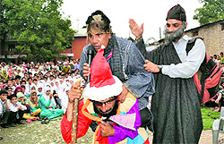 Srinagar, September 8 Today’s play was staged at central Kashmir’s Budgam district in which the popular Kashmiri television actor, Bashir Kuoter, participated. The play, ‘Anpad Gau Kharie Khuadaye’, revolved around the funny characters who had developed a world vision of their own and were not ready to buy any argument on corrective measures. The play, ‘Shaal Chalith Bathen Loray’, written and directed by Fayaz Ahmed Rather portrayed that how in a society one has to bear the brunt of few blacksheeps of the society. The play concluded with a social message telling the audience that one cannot escape from bearing the fruit of his good or bad deeds. The artistes included Fayaz Rather, Abdul Rehmaan, Mushtaq , Shafi, Mohammad Hasham, Mohammad Younus, Irshaad Majeed, Zahoor Ahmed, Tariq Ahmed, Manzoor Ahmed, Ghulam , Jalal , Ghulam and Nazir Bhat. former PCC chief Gulam Rasool Kar, and other party leaders. |