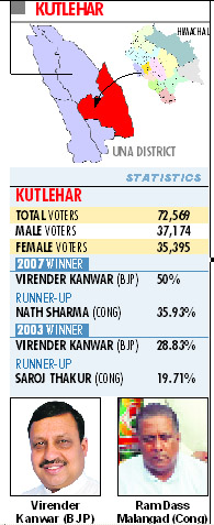 Virender Kanwar has also been elected twice from this constituency. Kanwar, who held the post of Chief Parliamentary Secretary and maintained good relations with Chief Minister PK Dhumal, claims credit for several development works undertaken by the Dhumal government in this area. He tells voters that he had been instrumental in initiating work on the Bangana tunnel, opening the SDM office and building of Bangana express highway etc. Kanwar is facing anti-incumbency. A section of the BJP had opposed the allotment of ticket to him and had approached the party high command and the state leaders to replace him. This faction accuses Kanwar of ignoring grassroots workers by not taking them into confidence. These people are also opposed to his style of functioning. Malangad is soft-spoken and mixes well with rural people. He has a good rapport with villagers. A Congress faction is also not happy with his joining the Congress and allotment of the ticket to him. There is an apprehension that a few Congress leaders would make efforts to sabotage his prospects. |