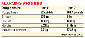 Hayer claimed traffickers had been smuggling poppy husk, opium and other dry drugs from Rajasthan, Madhya Pradesh, Uttar Pradesh and Jammu and Kashmir to Punjab while heroin and other such drugs were being brought from areas bordering Pakistan. Rajinder Singh, Superintendent of Police, said the amount of drug seizures in the current year was alarming. He said as many as 180 smugglers were arrested in 176 cases from March 1 to October 27 last year. The police had recovered 62 quintals of poppy husk, 638 gm of smack, 18.8 kg of opium, 3.53 kg of heroin, besides 2.7 kg of intoxicant powder. From March to October 27 this year, the police had arrested 432 smugglers in 315 cases under the NDPS Act and seized 184.7 quintals of poppy husk, 39.1 kg of methafitamine (ice or rave party drug) and 14.1 kg of chemical, 46.8 kg of opium, 1 kg of smack, 2.18 kg of charas, 11.02 kg of heroin, 1.5 kg of cocaine, 12.85 kg of intoxicant powder and synthetic drugs in bulk. Rajinder Singh said the drive of the state police against the drug menace had been intensified and more arrests and seizures were likely to be made in the coming months. 2 held with 10 kg opium in Patiala The local police today arrested two members of an inter-state gang with 10 kg of opium worth Rs 5 lakh. Patiala SSP Gurpreet Singh Gill said a police team under Nabha DSP Rajwinder Singh Sohal and Sub-Inspector Amanpal Singh nabbed the duo from the Satsang road and seized 5 kg of opium each from them. The accused had been identified as Ishwar Singh, son of Ganga Ram, and Manohar Singh, son of Sultan Singh. Gill said a case under NDPS Act had been registered. He said they were members of an inter-state gang which was active in Punjab and Haryana. — TNS |