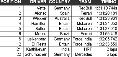 Greater Noida, October 28 “It’s a very positive track, very easy to manage the tyres,” he said. Vettel, along with the rest of the top 10 qualifiers, started on soft tyres before switching to hard ones on lap 33 in a one-stop strategy, without losing the lead. This was the strategy adopted by all the finishers. Fernando Alonso of Ferrari had taken his pit stop four laps earlier. He got to the runners-up place with ten laps to go, as the tyres proved true to his gameplan. However, McLaren’s Button completed the longest final stint on hard tyres, lasting 35 laps, which took him to the fifth place. And the Pirelli tyres, making their F1 debut here, proved a dependable part. Vettel said his fourth successive win was achieved after hard efforts, and his strategy was to take each race “step by step”. “Our team did a fantastic job. We had a fantastic race. We had no problem in any area. We prepared as much as we could.” Alonso warned that the championship race was not yet over. “I feel very optimistic, but we are not fast enough,” he noted. Drivers' Standings: (After 17 of 20 races); 1 S Vettel, Red Bull, 240 pts, 2 F Alonso, (Ferrari) 227, 3 K Raikkonen (Lotus) 173, 4 MWebber (Red Bull) 167, 5 L Hamilton (McLaren) 165. |