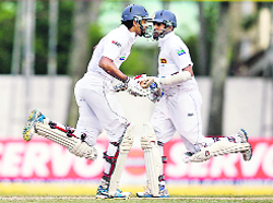 Thilan Samaraweera (R), Suraj Randiv take a run during the third day of their second Test against New Zealand on Tuesday. — Reuters