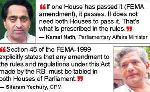 FDI: Govt, Left spar over FEMA amendment New Delhi, December 2 The government cannot implement FDI unless an amendment is made in the Foreign Exchange Management Act (FEMA). The Reserve Bank of India had issued a notification on October 30 amending FEMA. The government is required to inform Parliament about the changes as soon as possible as required by law. The government has 30 working days of Parliament to get the amendment passed. On Sunday, there were divergent views on how the amendment needed to be passed. While Parliamentary Affairs Minister Kamal Nath said only one House needs to approve the move, CPM’s Sitaram Yechury insisted both Houses have to clear it. The government on Friday tabled four amendments to the FEMA. That’s when the Opposition sensed an opportunity to corner the government. In an interview on a television show, Nath said the FEMA notification dealing with the amendment needs to be passed only by one House. “If one House has passed it, it passes. It does not need both Houses to pass it. That's what is prescribed in the Rules,” the minister said. He, however, pointed out that there were separate rules for the Lok Sabha and the Rajya Sabha. The crux of the technical debate is the CPM-led move to corner the government in Parliament on the amendment since the latter does not have adequate number of MPs in the Rajya Sabha for getting it passed unlike the Lok Sabha, where the ruling coalition has an edge. “Section 48 of the FEMA-1999 explicitly states that any amendment to the rules and regulations under this Act made by the RBI must be tabled in both the Houses of Parliament as early as possible. And once tabled, any member of either House can move amendments to the RBI amendment and can even move for the annulment of the RBI amendment within 30 days. Any such amendments would have to be considered by the House and decided upon. This can happen only through a vote,” Yechury said. “There is no way that the UPA-II government can avoid a vote in Parliament on this issue,” he said. Interpreting the rule, former Lok Sabha Secretary General PDT Acharya, told The Tribune: “If the Act explicitly states that if there is a statutory provision that amendments to rules and regulation, which is an executive decision, needs approval of both the Houses, then there is no option. Rejection by any House would mean the amended Act cannot be implemented.” As for the 30-day sitting period during which the amendment has to be taken up by the House, Acharya said in case it is not possible in the current session, the calendar would begin from day one of the subsequent session. On his part, Nath accepted that the FEMA notification, which can be passed in the budget session as well as the government has 30 working days of Parliament to get the nod, may drag into the next session, which is three months away.