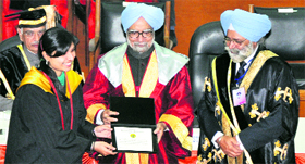 Prime Minister, Dr Manmohan Singh, addresses a gathering during the Golden Jubilee Convocation of the PAU in Ludhiana on Saturday. Tribune photo: himanshu mahajan