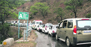 A stream of vehicles carrying pilgrims caught in a traffic jam near Katra. A Tribune file photo