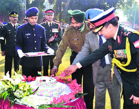 Jalandhar, December 16 Lieut-Gen Sanjeev Madhok, General Officer Commanding, Vajra Corps, veterans of the 1971 war and other senior serving, retired officers, JCOs and other ranks paid homage and tributes to the martyrs at the Vajra Corps War Memorial. Paying rich tributes to the martyrs, Gen Sanjeev Madhok assured their families that the Army had been supporting them and would extend all possible support to them. He stressed the need of operational readiness and exhorted all ranks to be well prepared for any eventuality. “Professional excellence alone can help us achieve such spectacular victories in the future,” said Madhok. "Vijay Divas" commemorates the finest hour of the Indian Armed Forces which came about with the triumph in the 1971 war. This historic victory signifies a unique and unparalleled feat, wherein Indian troops fought selflessly for a just and noble cause to liberate the people of Bangladesh. The Vajra Corps proved its mettle on the strategic Western Front and achieved its objectives with elan and vigour. A proud nation has conferred as many as eight MVCs, 47 Vir Chakras and numerous other awards on the valiant men of the Vajra Corps. The Vajra Corps has also been bestowed with the Theatre Honour: Punjab and Battle Honours: Sehjra and Dera Baba Nanak. |