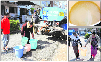 A woman fills water from a tanker; (right top) muddy water in a bucket; and residents lift a bucket of water at Sector 42 in Chandigarh on Friday.