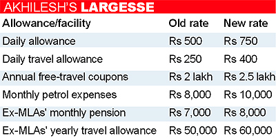 Lucknow, March 22 He also announced additional Rs 50,000 worth of free railway/air coupons, taking the annual free-travel coupons per MLA from Rs 2 lakh to Rs 2.5 lakh. The monthly petrol expenses have been enhanced from Rs 8,000 to Rs 10,000. From now onwards, the elected representatives have been exempted from paying even the subsidised rent for their official accommodation. Akhilesh also announced to raise the pension of ex-MLAs from Rs 7,000 to Rs 8,000 per month. Till now, only MLAs post-2010 were entitled to family pension, but today the CM announced the facility for the family of all former MLAs. The travel allowance of ex-MLAs has also been increased from Rs 50,000 per year to Rs 60,000 per year.