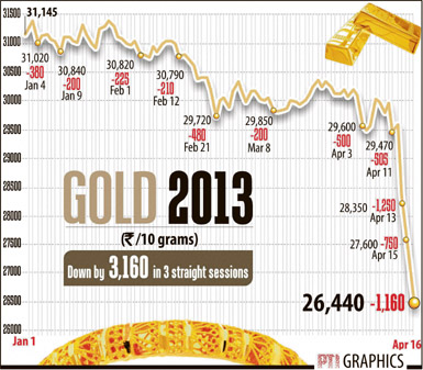 A stronger rupee kept the upside in prices limited. The rupee plays an important role in determining the landed cost of the dollar-quoted yellow metal. The actively traded gold for June delivery was 0.8% higher at Rs 25,842 per 10 grams on the MCX at 3.51 p.m., recovering from a low of Rs 25,270 struck earlier in the session, a level last seen in late September 2011. "Sales are not on the expected lines... Traders feel the current rally is a consolidation phase and market will come down," said a dealer with a bullion importing bank in Mumbai, adding premiums have increased by 10-20 cents to $1.8 an ounce on London prices. In the overseas market, gold rose 1 percent after a drop to a two-year low earlier in the session ignited physical buying, but investors frustrated by the metal's lacklustre performance remained cautious amid fears of central bank sales and global growth. In New York, gold plunged 9.35% to US $1,360.60 an ounce. The metal has dropped by $200 an ounce, or nearly 13%, in the last two trading days. Marketmen said sustained weakness in overseas markets, where gold plunged over 9% on Monday to its lowest level since February 2011, on worries over Chinese growth and possible selloff by struggling Cyprus's central bank, continued to influence the trading sentiment here. On the domestic front, gold of 99.9% and 99.5% purity fell by another Rs 1,160 each to Rs 26,440 and Rs 26,240 per 10 grams, respectively. The metal had lost Rs 2,000 in last two sessions. Sovereigns followed suit and lost Rs 900 to Rs 23,800 per piece of 8 grams. Similarly, silver ready remained under pressure and traded Rs 1,875 lower at Rs 46,125 per kg and weekly-based delivery by Rs 1,750 to Rs 44,150 per kilogram. The white metal had plunged Rs 4,600 in the previous two sessions. However, silver coins held steady.— PTI/Reuters Stocks gain most in seven months; Rupee biggest single-day gain since Jan 30