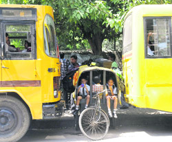 Risking lives: An auto-rickshaw sandwiched between two buses outside a school in Chandigarh. Tribune photo: Manoj Mahajan