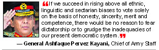 “If we succeed in rising above all ethnic, linguistic and sectarian biases to vote solely on the basis of honesty, sincerity, merit and competence, there would be no reason to fear dictatorship or to grudge the inadequacies of our present democratic system.” On the army’s role in the upcoming elections, he said, “I assure you that we stand committed to wholeheartedly assisting and supporting the conduct of free, fair and peaceful elections to the best of our capabilities and remaining within the confines of the Constitution. “I also assure you that this support shall solely be aimed at strengthening democracy and the rule of law in the country.” The General cautioned against creating doubts about the ongoing war on terror by discussing its genesis and who or how it began. "The reality is that now, it is our war,” he said. He reiterated that the fight against extremism was not just a fight for the army but for the nation. “If a group rises against the Constitution, wants to force their wrong thinking on us...For this purpose, it not only believes that all kinds of bloodletting is justified, but also takes up arms against the state, its judicial process and innocent civilians, then, is that someone else’s war? “Considering this war against terrorism as the war of the armed forces alone can lead to chaos and disarray that we cannot afford.” He added: “Our external enemies are busy fanning this fire.” He pointed out that treachery against the state and its Constitution were never tolerated and that, on such occasions, the question of ‘is this our war?’ was never raised. “A soldier’s mind and his mission cannot be subject to such doubts.” The army chief made a conditional offer to extremists asking them to return to the national fold, but only if they unreservedly accept the state of Pakistan, its Constitution and law. |
