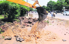 work: A JCB machine removes muddy water from a spot where a water pipline burst on Tuesday. The leakage kept the authorities on their toes for the whole day. tribune photo: manoj mahajan |