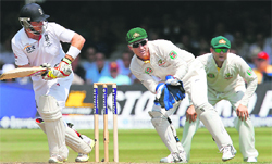 London, July 18 Bell, who came to the crease with England floundering at 28 for three on a perfect batting pitch at the height of a British heatwave, reached his 19th test hundred with 14 boundaries in exactly five hours. He was finally out for 109 and joins Jack Hobbs (twice), Wally Hammond and Chris Broad at the only England players to score centuries in three consecutive Ashes tests. Bell’s dismissal was the first of three wickets in the space of 31 minutes for Australian leg-spinner Steve Smith who reduced England from 271 for four to 289 for seven at the close of a sun-drenched day. After his resolute second innings century in the first test victory at Trent Bridge, Bell was in delightful touch from the start of his innings. He drove sweetly, cut deftly and after tea took three boundaries off a James Pattinson over, including two exquisite drives off the back foot through the covers. He was finally out when Michael Clarke turned to Smith’s occasional leg-spin and was rewarded when Bell edged the final ball of his first over to the Australian captain at slip. Smith followed up by tumbling to his left to take a return catch of Jonny Bairstow (67) who had batted confidently on the ground where he scored an impressive 95 against South Africa last year and helped Bell add 144 for the fifth wicket. Fortunate Jonny Bairstow had enjoyed a huge slice of luck when he was comprehensively bowled by Peter Siddle on 21 but won a reprieve when television replays showed the Australian paceman had over-stepped by a matter of millimetres. Matt Prior (6) became Smith’s third victim, slashing hard outside his off-stump and edging to wicketkeeper Brad Haddin. Ryan Harris was the pick of the Australian bowlers, finishing the day with three for 43 after coming in for Mitchell Starc in one of two changes to the side who lost the first test at Trent Bridge by 14 runs. Despite impressive test statistics, Harris, 33, had played only 12 tests because of a chronic knee injury which needs constant treatment. Shane Watson made the initial breakthrough in the fifth over, bowling as first change from the Pavilion end and beating Alastair Cook (12) with his second delivery from a full length. The ball struck Cook’s front pad straight in front of the stumps and the England captain decided against a review. His opening partner Joe Root (6) did go to the third umpire when he was struck on the pads by Harris but England lost a review when Marais Erasmus’s lbw decision was upheld. Kevin Pietersen fell four balls later to Harris for two, caught behind playing at a full delivery outside his off-stump and England were suddenly in trouble. Jonathan Trott, who had started confidently with boundaries on both sides of the pitch from his first two balls, struck the ball firmly, hitting 11 fours. But with the attack apparently at his mercy, he was out scooping a simple catch off Harris to Usman Khawaja, who replaced Ed Cowan at number three in the Australian lineup, at deep square-leg. Smith’s efforts late in the day meant the Australians, who laboured throughout the afternoon session with little reward, ended the day with honours at least even on a pitch still promising plenty of runs. “Credit has to go to Australia, Harris coming back into the team bowled really well,” Bell said. — Reuters Scoreboard England 1st innings |