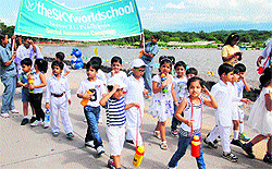 Students of The Sky World School, Sector 21, Panchkula, hold a march past at Sukhna Lake in Chandigarh on Tuesday.