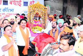 Om Parkash Soni, vice-president, PPCC (third to left), and Vikas Soni Youth Congress (urban) (centre) president during the shobha yatra on the eve of the birth anniversary of Maharishi Valmiki in Amritsar on Thursday. photo: sameer Sehgal