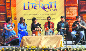 Tishaa Khosla, Kishwar Desai, Gul Panag, Vivek Atray and V Sudarshan during a session on ‘Women and paradox of modernity’ at Literati 2013 in Chandigarh on Sunday. Tribune photo: S Chandan