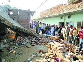 The house that collapsed after an LPG cylinder exploded at a slum area in Abohar on Friday. Tribune Photograph