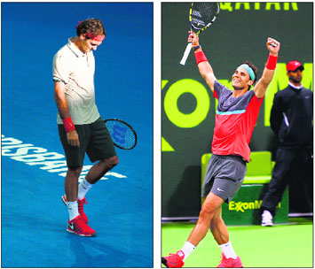 Roger Federer walks between points during his loss to Lleyton Hewitt in the final at the Brisbane International on Sunday; and Rafael Nadal celebrates after beating Gael Monfils in the final of Qatar’s ExxonMobil Open in Doha late on Saturday. AFP