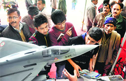 Most of the students are seeing the exact scale models of missiles, nuclear biological and chemical warfare suits and a host of other equipment developed by the organisation for the first time and are keen to know more about them. Despite intermittent rain since the start of the Indian Science Congress at the University of Jammu here on February 3, students from various schools have been thronging the special exhibition area which displays these models, besides information counters installed by various state and Central Government organisations. “I am happy to get information about Tejas (Light Combat Aircraft) and unmanned aircrafts like Rustom, Nishant and Lakshya. I have seen them for the first time. I also met several scientists. This type of exhibition has never been held here,” said Aditya Bhat, a class VII student. A number of innovative soldier protection and performance enhancement systems have been put on display by the Defence Research and Development Organisation and keeping in view the response of the students several senior scientists are interacting with the students and answering their queries. “All of them are full of questions and are quite curious about the missiles and other gadgets. We are doing everything to provide minutest of details and inspire these kids,” said Defence Research and Development Organisation ’s Regional Public Relation Officer (South Zone) NM