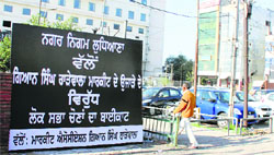 A board announcing the poll boycott by the shopkeepers of the Gian Singh Rarewala Market on the Link Road in Ludhiana. Photo: Inderjeet Verma