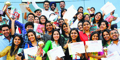 Students in a jubilant mood after receiving prizes at GGDSD College in Sector 32, Chandigarh, on Wednesday.