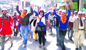 Mussoorie, April 5 They gathered at Picture Palace and from there party workers carrying brooms walked all the way through Mall Road till Library Bazaar raising slogans in Nautiyal’s favour. The Bollywood stars appealed to the people to vote for Nautiyal in the Lok Sabha elections. Archana Puran Singh said people like her had joined the party due to its commitment to getting the country rid of corruption. The people did not trust the BJP and the Congress any longer and therefore they were joining the AAP in large numbers, she added. She appealed to the people of Mussoorie to vote for Nautiyal to ensure his victory from Tehri Garhwal. Ayub Khan told the people that by voting and electing Nautiyal they would empower themselves. They would also be able to themselves take decisions regarding the constituency. Asked about politicians making derogatory remarks, he said it happened whenever leaders did not have issues and hence they stooped to a low level for political gains, which was unfortunate. “Politicians should use good language while seeking votes from people,” said Ayub Khan. Nautiyal later told mediapersons that he had joined politics to check corruption and assist in creating employment avenues for the youth in his constituency and better health services in the state. Ranbir Chaudhary (state treasurer), Rajesh Bahuguna (district secretary), Tushar Rawat (Mussoorie convener), Suneeta Singh (Dehradun co-convener), Pooja Bhalla, Vishal Kumar, Dependra Bhandari, Jaigopal, Rita Kumar and others also campaigned for Nautiyal.