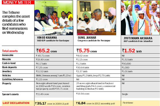 Ferozepur, April 9 Prominent Congress leaders who accompanied Jakhar included sitting MLAs Rana Gurmit Singh Sodhi (Guruharsahai), Parminder Singh (Ferozepur Urban), Karan Brar (Muktsar) and Mohammed Sadique; former MLAs Hans Raj Jossan, Mohinder Rinwa and Nathu Ram. Former ministers Balmukand Sharma and Malti Thapar, besides Satnam Kaur, Gurbir Singh Sandhu, Bhai Kukku, Raminder Awla, Gulshan Sharma were also present. Addressing the party workers, Jakhar said the state was reeling under economic bankruptcy with debts amounting to over ~1.1 kakh crore due to erroneous policies of the SAD-BJP regime. “The government has no money to pay salaries to its employees; what to talk about staggering arrears on account of pension and shagun schemes,” the Abohar legislator said. Accusing the ruling regime of pushing the state towards “anarchy”, Jakhar said the people of Punjab would give a befitting reply to the atrocities and mayhem unleashed by Akali leaders. Promises opening of borders Jakhar said he would make earnest efforts for the opening the Ferozepur-Lahore and Fazilka-Sadiqi India-Pakistan borders for trade and transit which would open floodgates of prosperity for lakhs of border residents. “I will ensure that the people get benefit of several Centrally sponsored schemes, besides creating employment opportunities in this hitherto neglected border area,” he assured. Nephew is his cover Jakhar’s nephew Sandeep Jakhar filed nomination papers as his covering candidate. Sandeep declared his assets worth ~16 crore. Quantum jump in assets In the 2012 assembly elections, Jakhar's assets were valued at ~6.84 crores with liabilities to the tune of ~176 crore. Since he has not liabilities this time, it indicates a quantum jump in his assets.