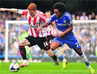 The Blues stunned by Sunderland London, April 19 Samuel Eto'o gave the home side the lead in the 12th minute, before Connor Wickham equalised six minutes later. Chelsea missed many chances before Fabio Borini converted a penalty in the 82nd minute. Meanwhile, the Premier League survival hopes of Cardiff City and Fulham remain no clearer after a draw with Stoke City and loss to Tottenham Hotspur respectively kept them marooned in the relegation zone with three matches remaining. Cardiff fought back from a goal down to draw 1-1 to move above 19th placed Fulham on goal difference after the west Londoners went down 3-1 at Spurs, who won with goals from Paulinho, Harry Kane and Younes Kaboul. The pair are two points behind Norwich City, who sit one place above the relegation zone and host leaders Liverpool on Sunday. Newcastle United slumped to their fifth straight loss after a late Wilfried Bony penalty earned Swansea City a 2-1 win, lifting the Swans to 36 points, six clear of relegation danger, while Crystal Palace's resurgence under Tony Pulis continued with their fifth consecutive victory courtesy of Mile Jedinak's second-half penalty in a 1-0 win at West Ham United. — Reuters |