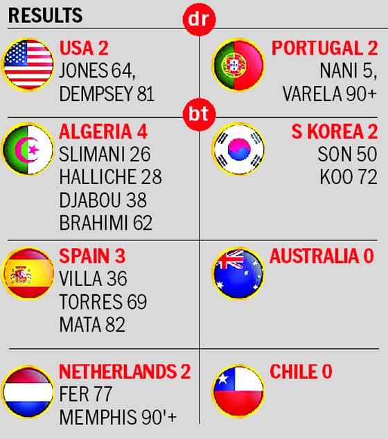 Belo Horizonte, June 23 It was the North Africans' first World Cup victory since their famous 1982 success against West Germany and was the first time an African side had managed four goals in a single World Cup match. First-half goals from Islam Slimani, Rafik Halliche and Abdelmoume Djabou did the damage as Korea were on already their knees at the break. Son Heung-Min and Koo Ja-Cheol gave Korea some hope in the second half but Yacine Brahimi's fourth for Algeria kept them in charge. The result spirited Algeria up to second in Group H behind Belgium, with Russia and the Koreans trailing on one point apiece. Algeria came out fighting for their World Cup lives, only too aware defeat would send them home. — Agencies |