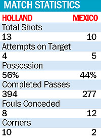 After the changeover, Mexico took the lead almost immediately with former Barcelona forward dos Santos breaking the deadlock with a brilliant shot from outside the box. Mexico continued to dominate play with the Dutch feeling the heat, literally. In the final half hour, the Dutch finally started showing why they are one of the favourites as they set up camp in the Mexico final third. It was all ‘Oranje’ in the final quarter of the game and it was only the magnificent Ochoa that stood in the way of a Dutch equaliser. Mexico adopted a defensive strategy, sat back and defended their lead. That turned out to be the wrong decision as the Dutch put Mexico under tremendous pressure. With the time winding down, Mexico would have been dreaming of a quarterfinal berth. But with just three minutes left on the clock, Sneijder finally broke through the Mexican defence to give his side a deserved equaliser. There was more heartbreak for Mexico as Robben was fouled in the box by Marquez, a foolish foul to give away, with the referee pointing to the penalty spot. Huntelaar, a substitute for Van Persie, stepped up and slotted in the penalty to give his team the unlikeliest of leads. — Agencies |