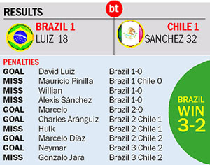 Belo Horizonte, June 29 Before the penalties Julio said, hit them with confidence and I’ll stop three,” said Brazil’s captain Thiago Silva. “It was preordained. Chile were a great team but we found strength. The most important thing is that the group is united, independent of any mistakes.” After the game Cesar said the result would lift the whole nation. “I’m very, very happy. I believe the Brazilian people just needed this,” he said. “We all needed this. We all knew it was going to be a very tough game. Chile deserve all our respect and that’s the way it’s going to be. I just hope the games that come now aren’t decided by penalties, otherwise our friends and families might have heart attacks,” he added. “This is something I’ve been saying over and over again. Many people were challenging my being selected. This shows I was well training for the World Cup. I must thank Felipao and the staff for all the training they have done for me. After what happened in 2010 I see how may people are just cheering for me and hoping for me after what happened.” Cesar referred to the quarter-final against the Dutch four years ago when he misjudged a cross for Holland to equalise — they went on to win. “After the [last] World Cup, to be labelled as the villain, it was very bad. I got the support of my family, who just supported me. This gives me the necessary strength. I apologise if I talk too much. I am trying to sum up four years’ work.” Suffered a lot, says NeymarBarcelona forward Neymar said afterwards that he had gone through emotional torment during the game. “We really suffered. It was pure emotion,” he said. “My tears after the game were of happiness. We know that it was not one of our best matches but the desire to win and get through to the next round that we showed was huge. It was the most I have ever suffered in football. Today I had everything. I took a knock, I had cramp. Now all I want to do is rest.” — Agencies |