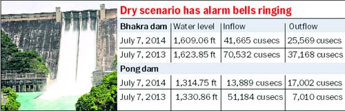 Ropar, July 7 The weak monsoon has increased the demand for water of partner states, including Haryana and Rajasthan, which has worsened the situation for the Bhakra management board. In case the present situation continues and rain remains elusive, water cuts to the partner states would become inevitable in August. The quantum of cuts, though, would depend upon the then water level in the dams. At present, the demand of the partner states was being met completely, and there was no need to press the panic button as of now, said sources. Today, the level at Bhakra was recorded at 1,609.06 feet, 14.79 feet less than 1,623.85 feet last year. The inflow in the reservoir stood at 41,665 cusecs, far below than last year's figure of 70,532 cusecs. The only consolation for the authorities was the release of water: 25,569 cusecs against 37,168 cusecs on the same day last year. The situation is comparatively bad at Pong dam, where the inflow is mainly based on rains in catchment areas. The water level stood at 1,314.75 feet against 1,330.86 last year. The inflow in the reservoir was recorded over three times lesser at 13,889 cusecs, against 51,184 cusecs last year. The outflow stood at 17,002 cusecs, compared to 7,010 cusecs in 2013.