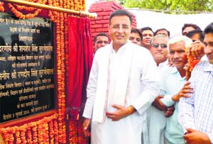 PWD and Industries Minister Randeep Singh Surjewala lays the foundation stone of the Rs 13 crore bypass project in Kaithal on Wednesday. TRIBUNE PHOTO