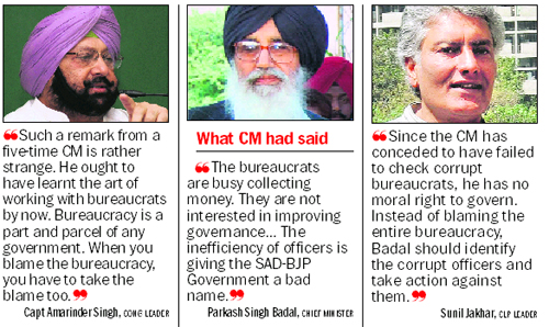 Chandigarh, July 13 The bureaucrats are worried that with the Chief Minister venting his ire against them at a public function, things are going to be difficult for them, at least for the time being. Most of thems, including those present at the NABARD function, said the CM's comment made it evident that they were under the scanner. "It could mean more raids to check if officers are attending office and more control over them. Whenever politicians lose elections, they start blaming the bureaucracy," said a senior officer. Congress MLA Sukhjinder Singh Randhawa, criticising Badal, said: "It's strange that the Chief Secretary, who was present at the function where the CM made the remark regarding bureaucrats being corrupt, chose to keep mum and not defend his team of officers. Badal's admission shows he has lost control over the bureaucracy and is unable to check corruption. Either he should resign for failure to exercise administrative control or book the corrupt bureaucrats." The Punjab IAS Officers Association expressed its unwillingness to react to the CM's remark. The association is in the process of electing a new president. Its outgoing president, Sarvesh Kaushal, had resigned when he took over as Chief Secretary, Punjab. Former Congress MLA Sukhpal Singh Khaira dared Badal to either name the corrupt bureaucrats and take action against them or quit. "The startling disclosure by the CM needs to be probed," he said, adding that Badal should draw up a roadmap for dealing with corruption. The Congress Deputy Leader in the Lok Sabha, Capt Amarinder Singh, asked Badal to set his own house in order rather than finding fault with the bureaucracy. "Such a remark from a five-time CM is rather strange. He ought to have learnt the art of working with bureaucrats by now. Bureaucracy is a part and parcel of any government. When you blame the bureaucracy, you are at fault too," he said, adding that Badal had now realised that the people of Punjab were angry with him and his government. |