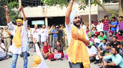 SOPU members hold a protest outside the Vice-Chancellor's office at Panjab University on Tuesday. Tribune Photo: Manoj Mahajan