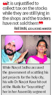 Joshi accused the officials of Excise and Taxation Department of misguiding the government on the issue. He said, "It is unjustified to collect tax on the stocks while it is still lying in the shops and the traders have not sold any of it." Taking a stiff stand against his own government, he exhorted the traders not to deposit any advance tax. He stated that while the government was yet to make tax refunds of crores, it was resorting to pressure tactics to recover further taxes from the traders. The BJP minister said he had earlier apprised Deputy Chief Minister Sukhbir Badal of the traders' demand and the government had even assured to withdraw the tax. He stated that "corrupt department officials were harassing the traders for their vested interests". He threatened that the traders would make public the names of the "corrupt" officials if they had to stage protest on Tuesday. Anil Mehra, a leading trader, said the government had implemented advance tax without even thinking whether it was feasible or not. He said it was practically not possible for the trading community to pay advance tax. "How can we pay taxes on goods even before selling them," he wondered. He said there was widespread resentment among the traders as their repeated pleas to withdraw advance tax had fallen on deaf ears. He also said that no other state in the country had introduced advance tax. Incidentally, Joshi is not the first BJP leader from Amritsar to have raised his voice against the state government. It was only last year that the then BJP MP from Amritsar Navjot Singh Sidhu had locked horns with the state government, particularly the Badals, whom he had accused of scuttling his pet projects for the holy city. He had also threatened to stage a dharna against the government, though he was later pacified. His wife Dr Navjot Kaur Sidhu too had come out against the Akalis for "boycotting" her in her Assembly constituency. A few days back too, Dr Sidhu and senior BJP leader Laxmi Kanta Chawla had vent their ire against the government over "indiscriminate chopping of trees" in Amritsar. |