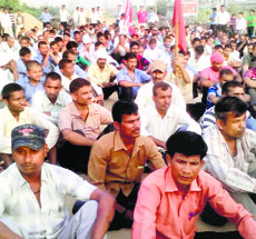 Hero Cycle Mazdoor Union members raise slogans at Giaspura Chowk in Ludhiana on Friday. A Tribune photograph