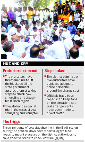 To keep the situation under control, the district administrative authorities have not only deployed adequate police personnel around the dharna spot but also roped in its officials to keep a tab on the situation. Special arrangements have also been made to divert vehicular traffic. Three incidents of cow slaughtering in the Badli region during the last six days have made the villagers block roads to mount pressure on the district authorities to take effective steps to check cow smuggling. The villagers have started undertaking a ‘thikri pehra’ in the villages to rein in cow slaughter. However, the villagers managed to nab 17 cow smugglers from Goyla Kalan village three days ago. Sources said the decision to resort to a road blockade was taken by the villagers when Sant Gopal Dass visited various villages of the Badli region last evening. Implementing the decision, villagers disrupted vehicular traffic on the highway near Rohad village. The villagers staged a dharna in the open at night in the presence of Sant Gopal Dass and refused to lift the blockade when district officials reached there to persuade them. In a bid to intensify the agitation, villagers also blocked the Bahadurgarh, Gurgaon, Delhi, Beri and Chhuchhakvaas roads by putting trees and other hurdles this morning. Jhajjar SP Balbir Singh visited all agitation spots but failed to persuade the protesters to lift the blockade which was continuing till the filing of this report. Neither the Jhajjar DC nor the SP could be contacted despite repeated attempts. |