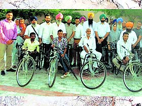 MLA Manpreet Singh Ayali, SGPC member Gurcharan Singh Grewal and others with the people who were given tricycles at Nathowal village near Raikot. A Tribune photo