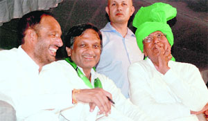 (From right) Om Prakash Chautala, INLD supremo, Kulbhushan Goyal, Panchkula candidate, and Pradeep Chaudhary, Kalka candidate, at a rally in Sector 16, Panchkula, on Tuesday. Tribune Photo: Nitin Mittal