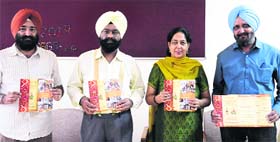 MS Marwaha (second from left), Principal, SGGS College-26, and other staff members release a brochure of the upcoming Youth Festival Zone A on the college campus on Tuesday. Tribune Photo: S Chandan