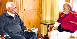 Bhim Singh apprised the Governor about the hardships being faced by border residents due to continuing incidents of ceasefire violations across the border and the Line of Control. He also discussed with the Governor issues relating to relief and rehabilitation of flood victims in the state. Bhim Singh shared his views about the emerging political scenario. |