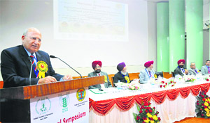 The chairman of the Trust for Advancement of Agricultural Sciences, Dr RS Paroda, addresses a gathering during the national symposium at PAU in Ludhiana. Tribune photo: Himanshu Mahajan