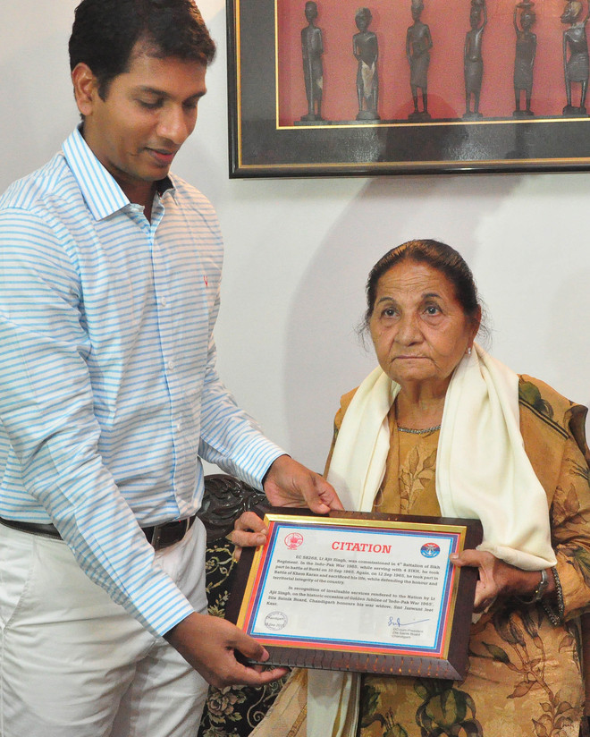 Jaswant Jeet was honoured by the UT Administration for her husband’s sacrifice. Deputy Commissioner SB Deepak Kumar presented her a shawl, a citation and a cheque for Rs 15,000 at her residence in Sector 35 today.