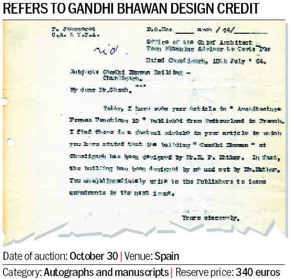 The letter, a copy of which was sent to Anthony Krafit, a journalist in Switzerland, sought rectification of a mistake in an article of Santosh Ghosh, which was published from Switzerland in French language. Ghosh had mentioned in the article that a building, ‘Gandhi Bhawan’’ at Chandigarh, has been designed by BP Mathur. Jeanneret wrote: “In fact, the building has been designed by me”. The letter was written to Ghosh with an address of Calcutta.