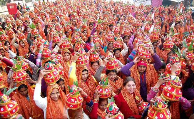 As part of the tradition, women devotees held a grand kalash yatra with Ganga jal fetched in specially made earthen pots and ferried to the katha venue at Geet Gobind.