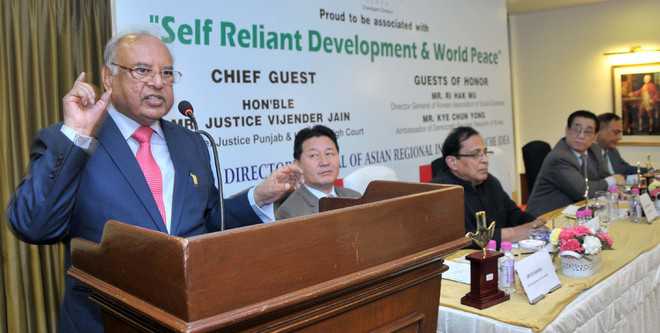 A conference on ‘Self-reliant development and world peace’ was held here today in the presence of Vijender Jain, former Chief Justice, Punjab and Haryana High Court, Chandigarh, RI Hak Mu, Director General of Korean Association of Social Sciences, Kye Chun Yong, Ambassador of the Democratic People Republic of Korea, Harish Gupta, Director General of the Association Regional Institute of Juche Idea. Piyushi Jain welcomed the dignitaries.